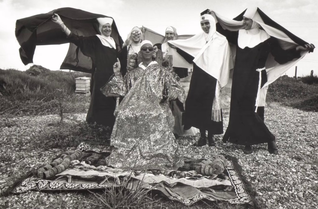 Jarman subtitles At Your Own Risk “A Saint’s Testament,” referring to his official canonization by the Sisters of Perpetual Indulgence. This international order of gay nuns (Sister Jack-Off All Trade, Mother Fecundity of the Mass Uprising, etc.) creates saints in recognition of individuals who have fought for the rights of queers. (“Pope John Paul II has created 234 new saints, at the rate of 19 a year, so it’s time we started.”) With Jarman – now known more familiarly as “Saint Derek of Dungeness of the Order of Celluloid Knights” – they found the perfect subject.