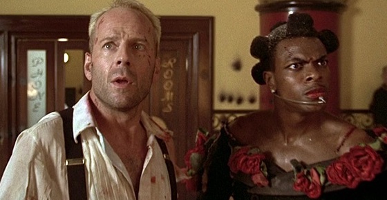Unfortunately, wardrobe is all that’s imaginative about the character. The Fifth Element is as fixated on the maleness of its trans person as Escape from L.A. was, and like the pistol-packin’ Hershe, Ruby Rhod also carries a phallic prop: a cane/microphone. Overkill here too, because he needs the shtick less. For all his girlish makeup and hairdo and outfits, Ruby is a compulsive het horndog who throws himself at various dazzled females and settles on a flight attendant, burying his head right where such hounds are wont to sniff. (While there he tongues her to, of course, the orgasm of her life.) When she insists that Ruby assume his individual position, he tells her, “I don’t want one position! I want all positions!” But nothing ever happens that would imply he might want to position his head between a man’s legs. Instead, Ruby Rhod is a textbook example of what film historian Vito Russo called a “yardstick sissy”: an unthreatening girly man whose faggotry makes the leading man seem all the more masculine. Ruby actually gets to protect, for at least part of one scene, the magical stones that will save the Earth, but when it’s show time Miss Thing can’t figure out how to activate them – unlike the three white guys who are also part of the mission – and so must stammer for a real man to come to the rescue.