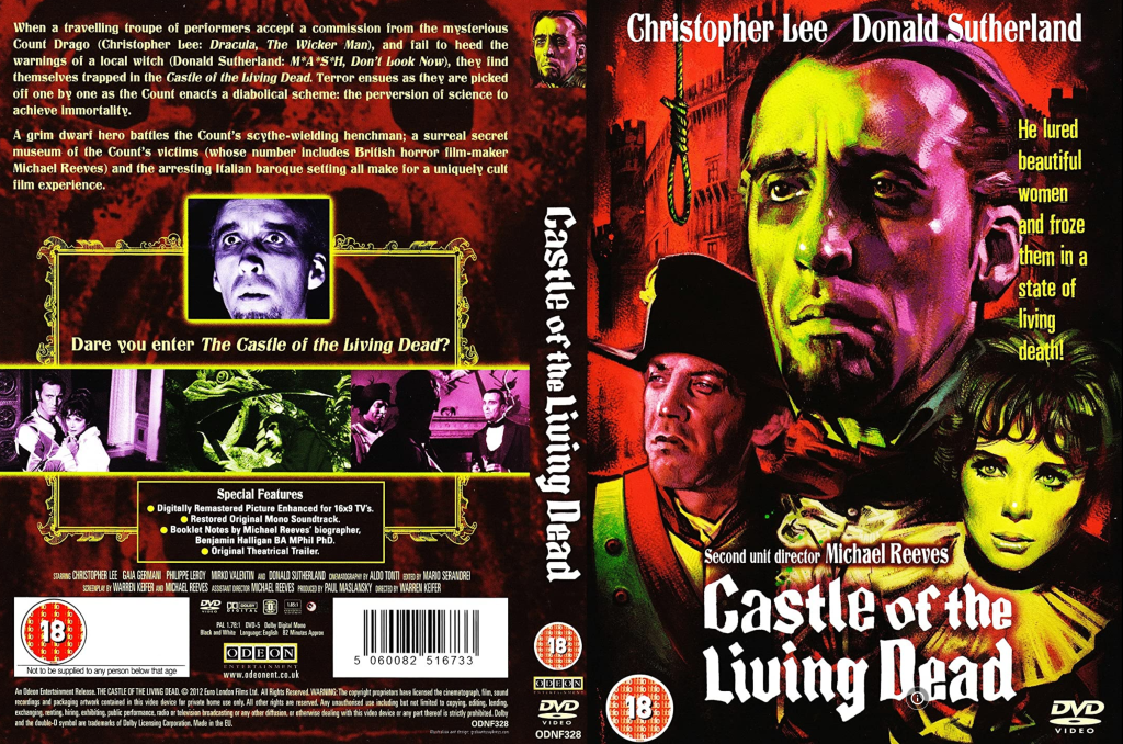 Kiefer’s film has been absorbed into the movies and mythos of Michael Reeves, his nominal subordinate, just as the visual flair that occasionally illuminates director Robert Stevenson’s 1943 Jane Eyre is today enjoyed as a reflection of that film’s uncredited co-producer, who also starred as Rochester: Orson Welles. No surprise then to see the British DVD of The Castle of the Living Dead, released by Odeon in 2012 – almost fifty years after the film’s premiere – citing Reeves’ name four times on its back cover, while the front announces in a prominent blurb just above the film’s title, “Second unit director Michael Reeves.”