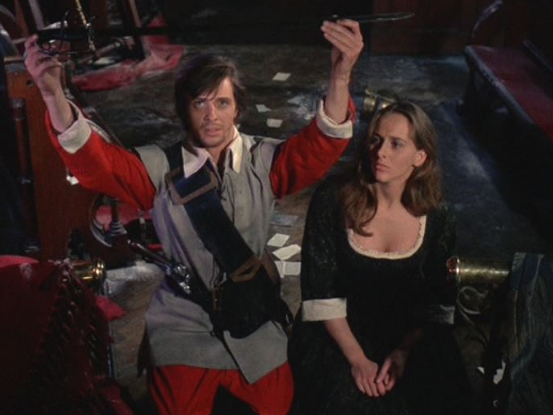 Ian Ogilvy stars as Marshall, a soldier in Cromwell’s army, seen battling royalists in a brutal gunfight amid the country’s lush forests. Richard visits his beloved Sara and leaves her in the care of her uncle, the town priest, so he can return to England’s civil war; on the road from town he encounters a group of villagers awaiting the arrival of Matthew Hopkins. Once among them, Hopkins has Sara’s uncle arrested, tortured, and imprisoned for witchcraft. He spares the priest further abuse only after Sara submits to his sexual advances. But when Hopkins returns the next evening to force himself on Sara again, this time he is observed by his despicable assistant Stearne. Reeves’ recurring theme of voyeurism accelerates the plot, with Stearne then overpowering and raping Sara as well – after which Hopkins rejects her and condemns her uncle to death. When Richard returns to his traumatized fiancée, he brings her into the church, now desecrated and vandalized by the irate villagers, and conducts their own marriage ceremony; he also holds up his sword and pledges to take revenge on Hopkins. That moment in their wedding is Richard’s only real bond: When Sara embraces him before he leaves to rejoin the army, he automatically pulls away from the touch of his despoiled wife, in his own way as repelled by her as Hopkins was.