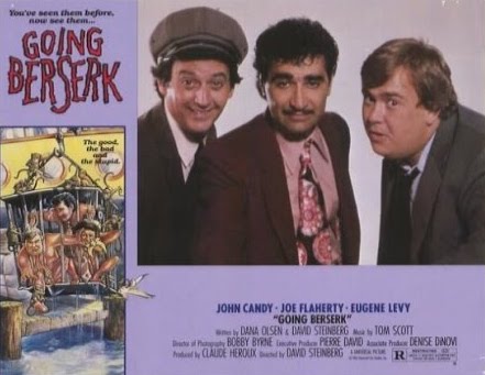 Everyone who has been waiting for the film that would showcase the amazing talents of SCTV stars John Candy, Eugene Levy, and Joe Flaherty will have to keep waiting; Going Berserk is a major disappointment. Director David Steinberg (who co-authored the script with Dana Olsen) has given his stars a hopelessly inadequate vehicle, and the laughs – while genuine – are few. One of the joys of SCTV at its best was the way a situation would modulate gracefully into something completely unexpected: “The Merv Griffin Show” turning into Close Encounters of the Third Kind, for example. Going Berserk strains for this kind of structural fluidity, but winds up as nothing more than a slovenly written, ineptly paced mess. The film is at its funniest when it parodies other movies, such as The Defiant Ones, The Manchurian Candidate, The Blue Lagoon, Kung Fu flicks, and even “Father Knows Best.” But when Going Berserk branches out to lampoon punks, bikers, religious sects, psychiatrists, male strippers, etc., Steinberg and Olsen reveal their aimlessness and lack of imagination.