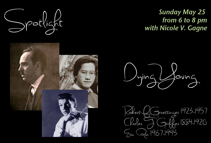 This show, first broadcast on May 25, 2014, examines the music of three gifted and original American composers, all of whom died way too young: Charles T. Griffes, who reinvented impressionist techniques in his piano and orchestral music, only to die of complications from influenza at age 35 in 1920; Robert F. Graettinger, radical innovator who used Stan Kenton’s big band to perform his own visionary scores, but died from lung cancer at age 33 in 1957; and Eric Qin, composer of inventive and exquisite works, who was just coming into his own musically when he was killed by a hit-and-run driver at age 25 in 1993. The following compositions are heard: