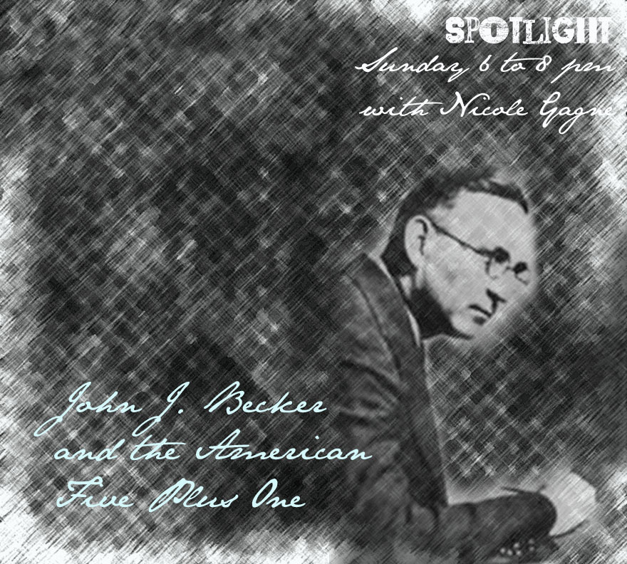 This show, first broadcast on February 22, 2015, focuses on one of the early “ultramodernists” of American music: John J. Becker. His association with four other modernists of his time – Charles Ives, Carl Ruggles, Henry Cowell, and Wallingford Riegger – has caused them to be known as the “American Five.” This show also looks at Becker’s involvement with Ezra Pound, the American poet and translator and composer and musician, who provided some texts for Becker’s songs. The compositions heard are: