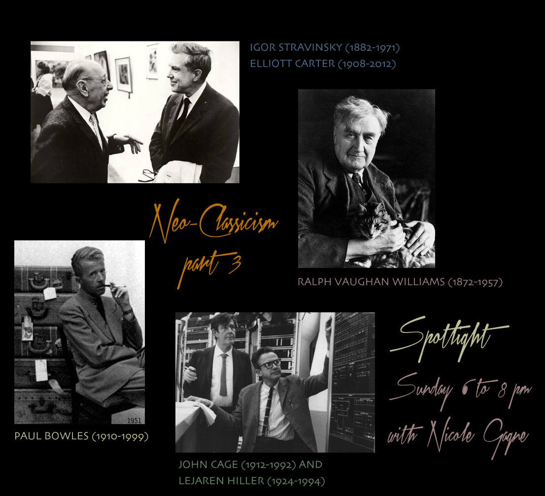This show, first broadcast on December 6, 2015, looks at the twilight of neo-classical composition in the 1940s and 1950s. As an idiom for modernists who resisted atonality, neo-classicism continued to attract interest in these years, with notable scores from England’s Ralph Vaughan Williams and Americans Paul Bowles and Elliott Carter. Igor Stravinsky was then still the style’s chief exponent, although he (along with Carter) would go on to write atonal scores in the 1950s. A postmodern approach to the use of classical forms is also considered in electronic music co-composed by John Cage and Lejaren Hiller. Carter, Cage, and Hiller are quoted from my own interviews with them. Works heard are: